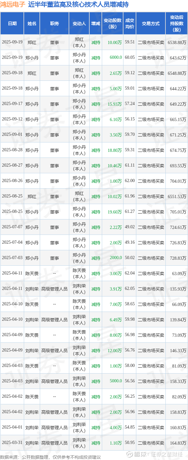 鸿远电子的高管列表及最新持股情况如下:
