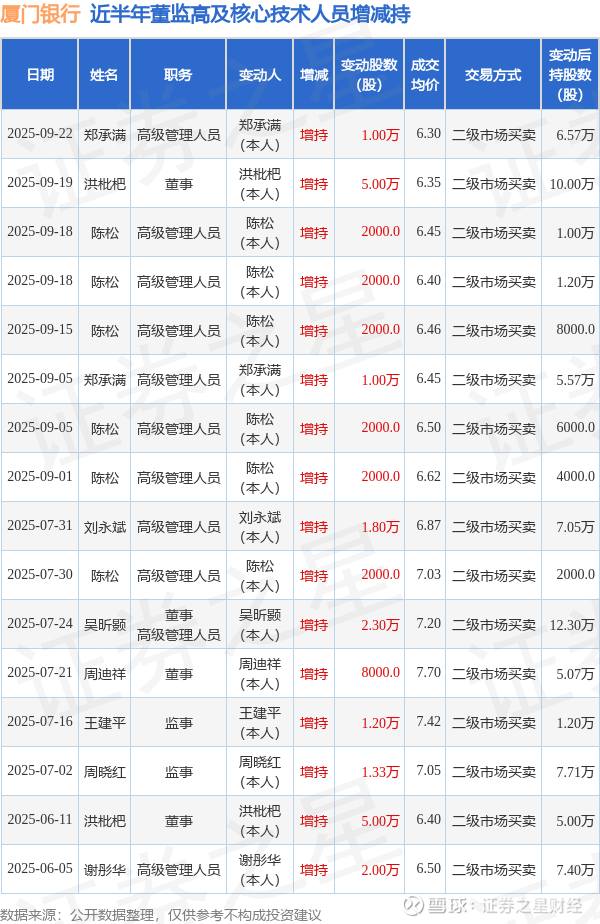 厦门银行近半年内的董监高及核心技术人员增减持详情如下: