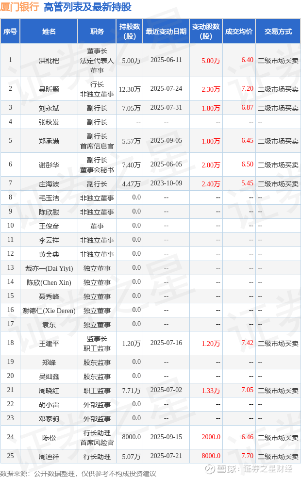 证券之星消息,根据9月22日市场公开信息、上市公司公告及交易所披露数据整理,厦门银行(601187)最新董监高及相关人员股份变动情况:2025年9月22日公司高级管理人员郑承满共增持公司股份1.0万股,占公司总股本为0.0004%。变动期间公司股价下跌1.1%,9月22日当日收盘报6.3元。