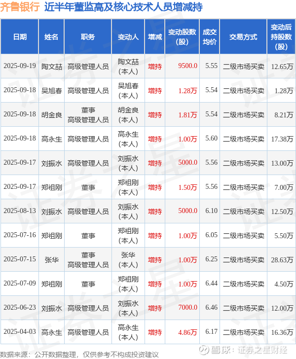 齐鲁银行近半年内的董监高及核心技术人员增减持详情如下: