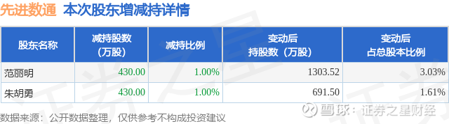 证券之星消息,9月22日先进数通发布公告《先进数通:股东减持股份实施情况公告》,其股东范丽明、朱胡勇于2025年6月25日至2025年9月19日间合计减持860.0万股,占公司目前总股本的1.9998%,变动期间该股股价下跌2.83%,截止9月19日收盘报15.46元。