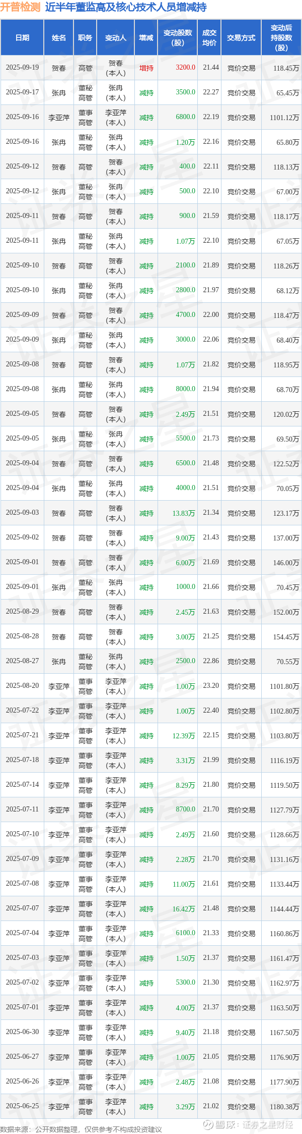 开普检测近半年内的董监高及核心技术人员增减持详情如下: