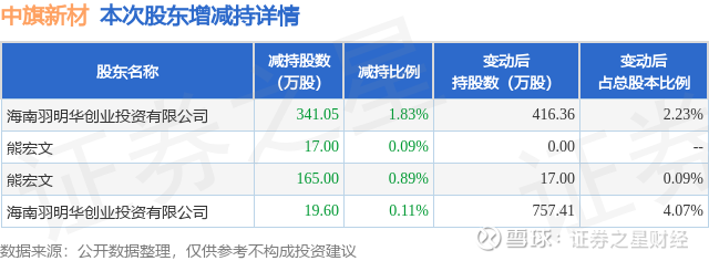证券之星消息,9月22日中旗新材发布公告《中旗新材:关于公司股东及其一致行动人减持完成的公告》,其股东熊宏文、海南羽明华创业投资有限公司于2025年8月25日至2025年9月19日间合计减持542.65万股,占公司目前总股本的2.9128%,变动期间该股股价上涨0.5%,截止9月19日收盘报56.18元。