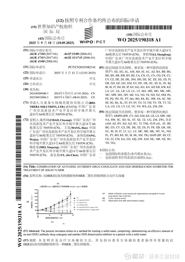 证券之星消息,根据企查查数据显示百奥泰(688177)公布了一项国际专利申请,专利名为“抗HER2抗体药物偶联物和HER二聚化抑制剂联合治疗实体瘤”,专利申请号为PCT/CN2025/082141,国际公布日为2025年9月18日。