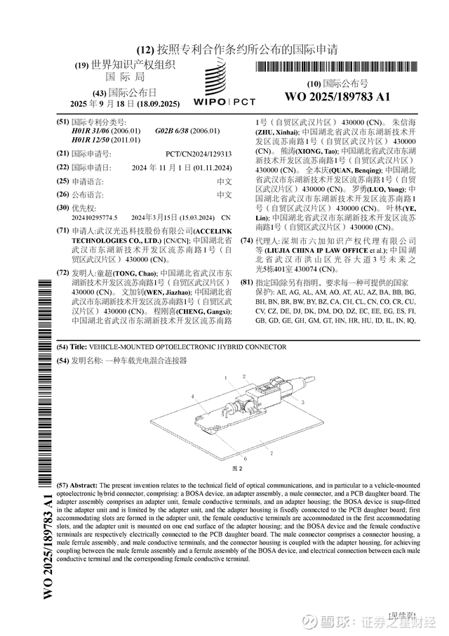 证券之星消息,根据企查查数据显示光迅科技(002281)公布了一项国际专利申请,专利名为“一种车载光电混合连接器”,专利申请号为PCT/CN2024/129313,国际公布日为2025年9月18日。