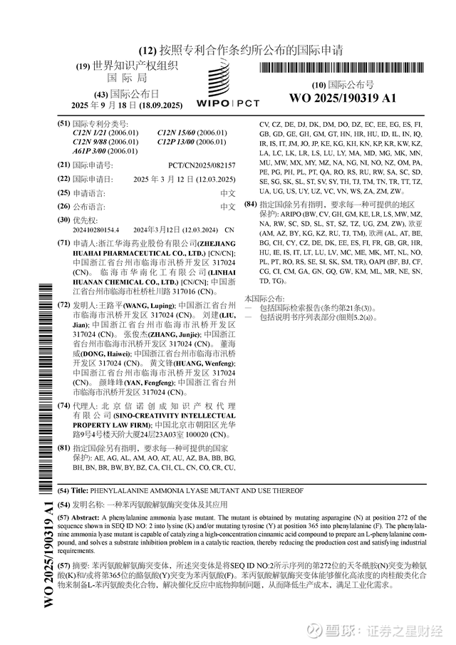 证券之星消息,根据企查查数据显示华海药业(600521)公布了一项国际专利申请,专利名为“一种苯丙氨酸解氨酶突变体及其应用”,专利申请号为PCT/CN2025/082157,国际公布日为2025年9月18日。
