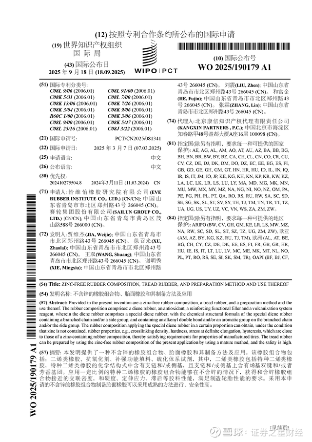 证券之星消息,根据企查查数据显示赛轮轮胎(601058)公布了一项国际专利申请,专利名为“不含锌的橡胶组合物、胎面橡胶和其制备方法及应用”,专利申请号为PCT/CN2025/081341,国际公布日为2025年9月18日。