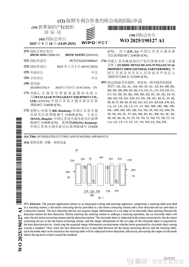 证券之星消息,根据企查查数据显示先导智能(300450)公布了一项国际专利申请,专利名为“切叠一体机设备”,专利申请号为PCT/CN2025/080663,国际公布日为2025年9月18日。