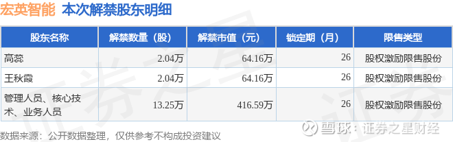 证券之星消息,根据市场公开信息整理,宏英智能(001266)于9月23日将有17.33万股限售股份解禁,为公司股权激励限售股份,占公司总股本0.17%。(本次数据根据历史公告整理得出,实际情况以上市公司最新公告为准)最近一年内,该股累计解禁2224.11万股,占总股本的21.56%。本次解禁后,公司还有4548.38万股限售股份,占总股本44.09%。具体如下图所示: