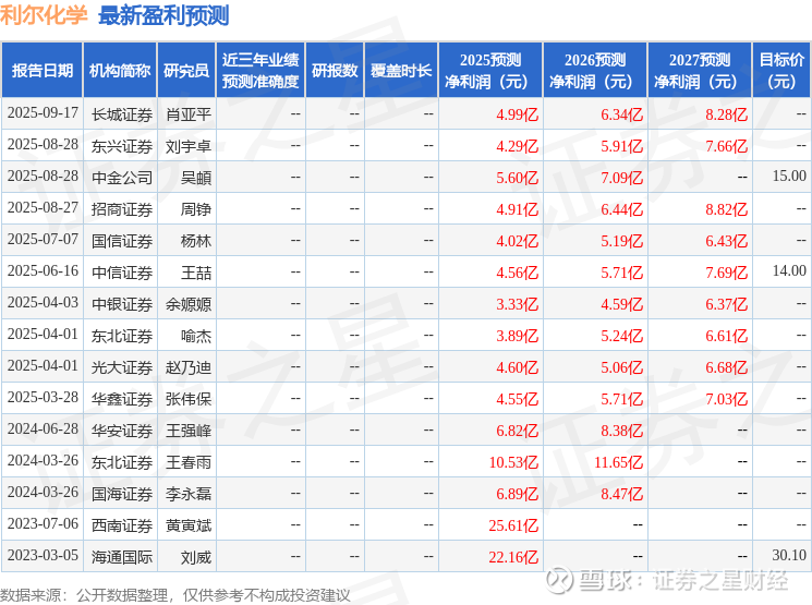 最新盈利预测明细如下: