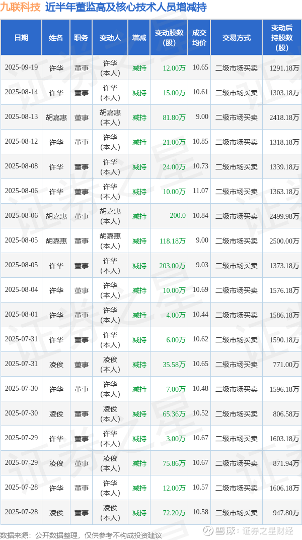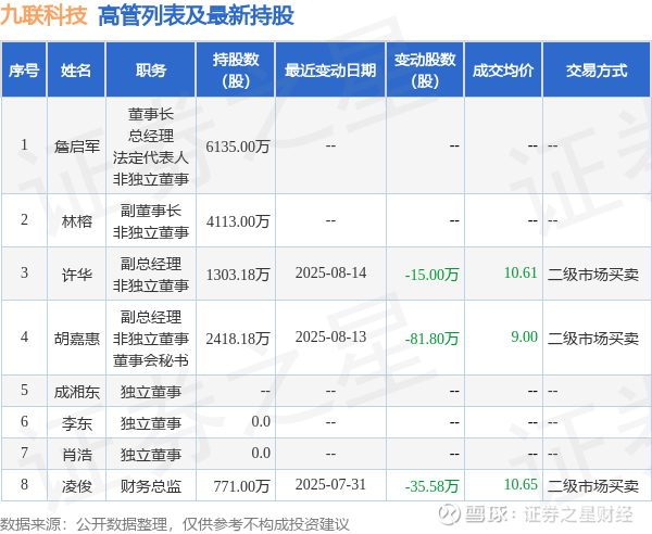 九联科技近半年内的董监高及核心技术人员增减持详情如下: