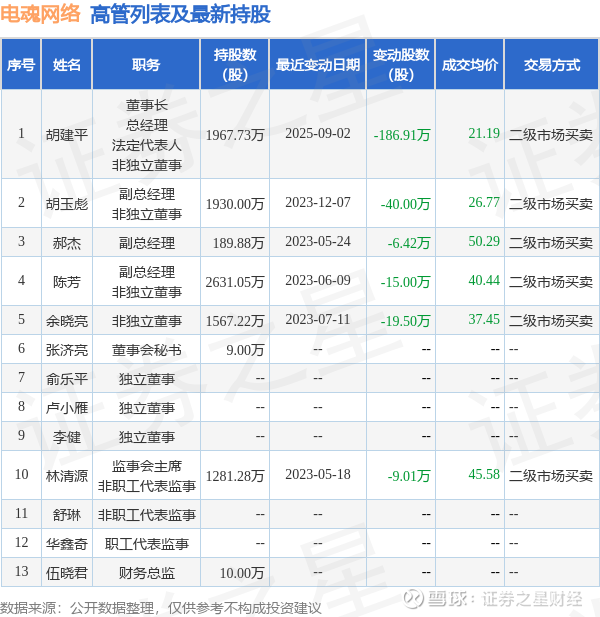 电魂网络近半年内的董监高及核心技术人员增减持详情如下: