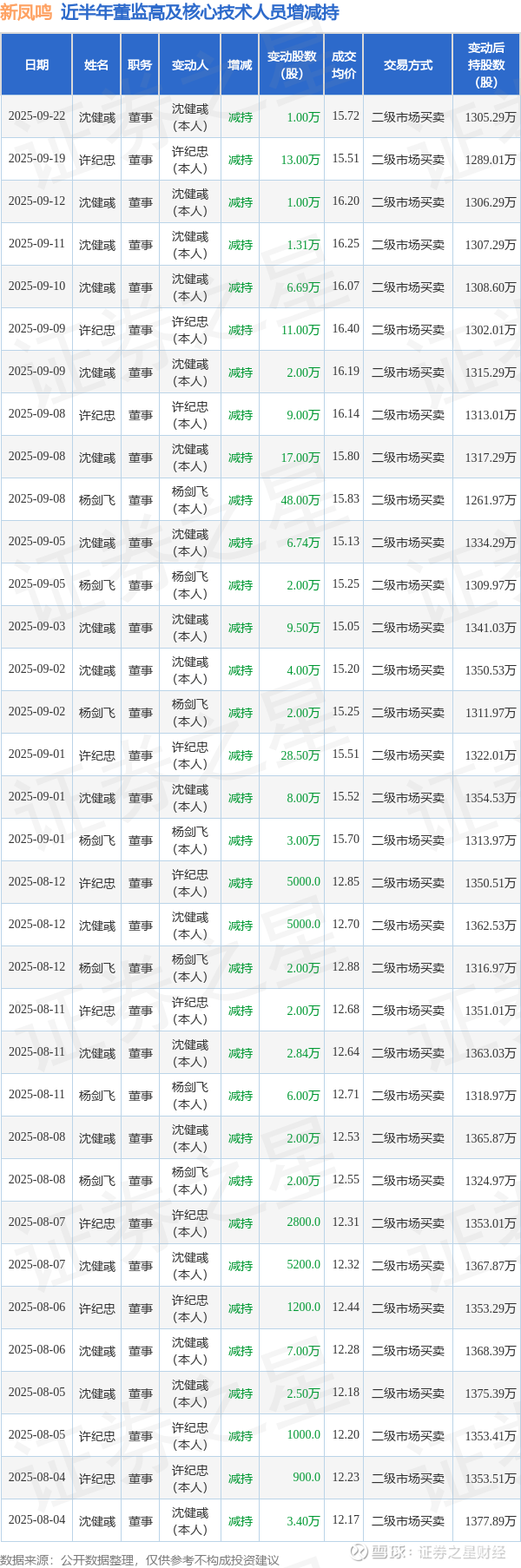 证券之星消息,根据9月23日市场公开信息、上市公司公告及交易所披露数据整理,新凤鸣(603225)最新董监高及相关人员股份变动情况:2025年9月22日公司董事沈健彧共减持公司股份1.0万股,占公司总股本为0.0007%。变动期间公司股价下跌0.06%,9月22日当日收盘报15.56元。