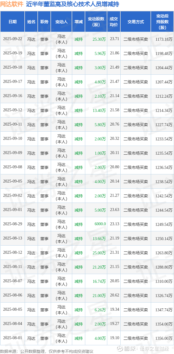 网达软件近半年内的董监高及核心技术人员增减持详情如下: