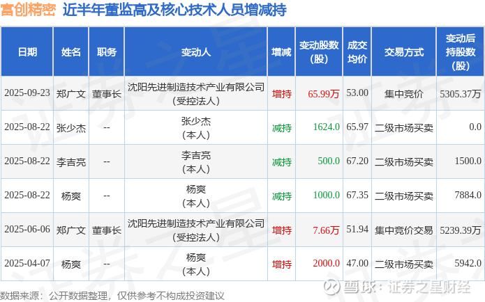 证券之星消息,根据9月23日市场公开信息、上市公司公告及交易所披露数据整理,富创精密(688409)最新董监高及相关人员股份变动情况:2025年9月23日公司董事长郑广文共增持公司股份65.99万股,占公司总股本为0.2155%。变动期间公司股价上涨0.11%,9月23日当日收盘报65.0元。