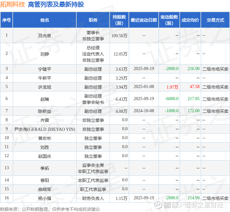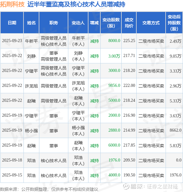 证券之星消息,根据9月23日市场公开信息、上市公司公告及交易所披露数据整理,拓荆科技(688072)最新董监高及相关人员股份变动情况:2025年9月22日至2025年9月23日公司董事,高级管理人员刘静、高级管理人员,核心技术人员宁建平、高级管理人员,核心技术人员牛新平、高级管理人员许龙旭、高级管理人员赵曦共减持公司股份5.59万股,占公司总股本为0.02%。变动期间公司股价上涨9.39%,9月23日当日收盘报229.9元。