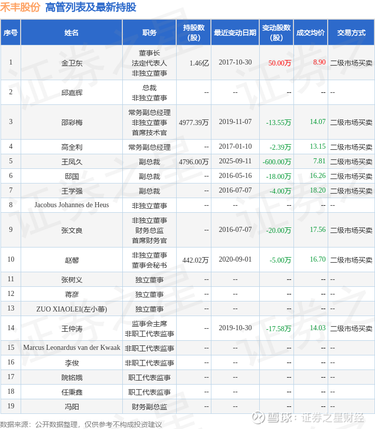 禾丰股份近半年内的董监高及核心技术人员增减持详情如下: