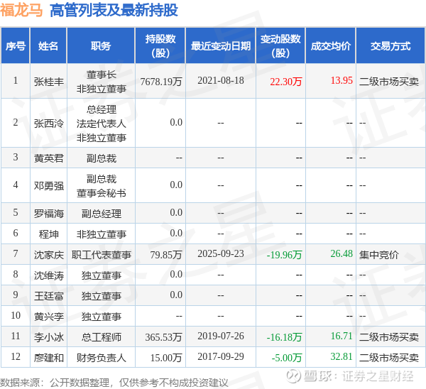 证券之星消息,根据9月23日市场公开信息、上市公司公告及交易所披露数据整理,福龙马(603686)最新董监高及相关人员股份变动情况:2025年9月23日公司职工代表董事沈家庆共减持公司股份19.96万股,占公司总股本为0.048%。变动期间公司股价上涨9.99%,9月23日当日收盘报27.97元。