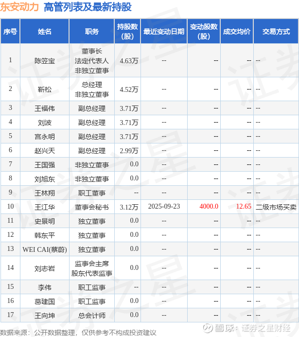 证券之星消息,根据9月23日市场公开信息、上市公司公告及交易所披露数据整理,东安动力(600178)最新董监高及相关人员股份变动情况:2025年9月23日公司高级管理人员王江华共增持公司股份4000.0股,占公司总股本为0.0009%。变动期间公司股价下跌1.01%,9月23日当日收盘报12.8元。