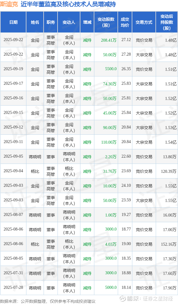 斯迪克近半年内的董监高及核心技术人员增减持详情如下: