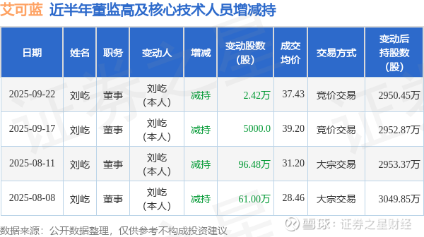 证券之星消息,根据9月23日市场公开信息、上市公司公告及交易所披露数据整理,艾可蓝(300816)最新董监高及相关人员股份变动情况:2025年9月22日公司董事刘屹共减持公司股份2.42万股,占公司总股本为0.0303%。变动期间公司股价上涨0.75%,9月22日当日收盘报37.56元。
