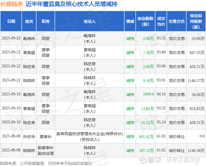 长盛轴承近半年内的董监高及核心技术人员增减持详情如下: