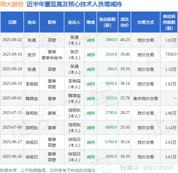 同大股份近半年内的董监高及核心技术人员增减持详情如下: