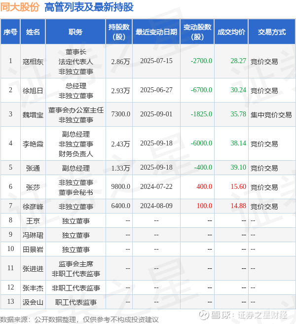 同大股份的高管列表及最新持股情况如下: