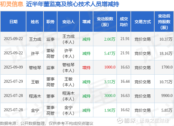 初灵信息近半年内的董监高及核心技术人员增减持详情如下: