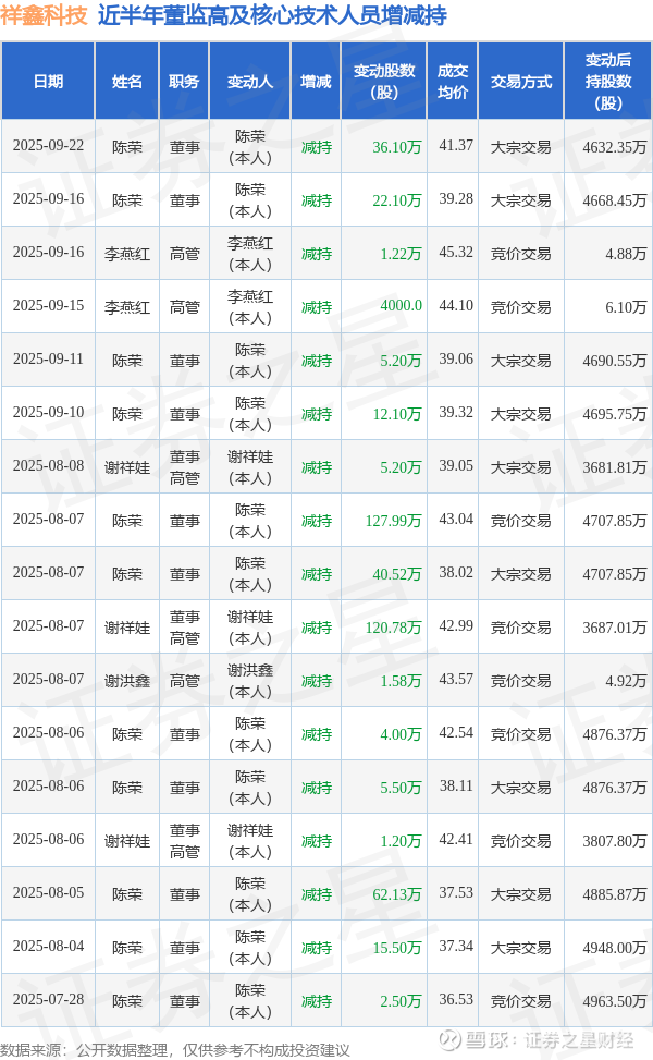 祥鑫科技近半年内的董监高及核心技术人员增减持详情如下: