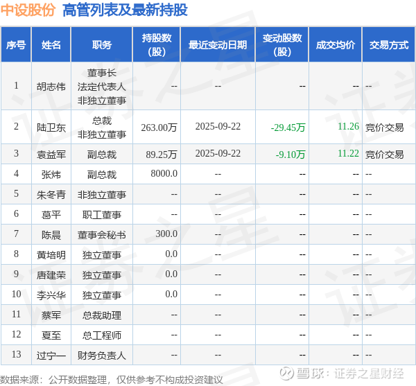 中设股份近半年内的董监高及核心技术人员增减持详情如下:
