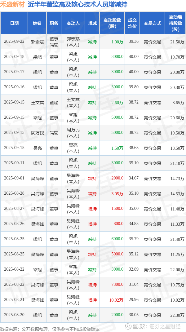 禾盛新材近半年内的董监高及核心技术人员增减持详情如下: