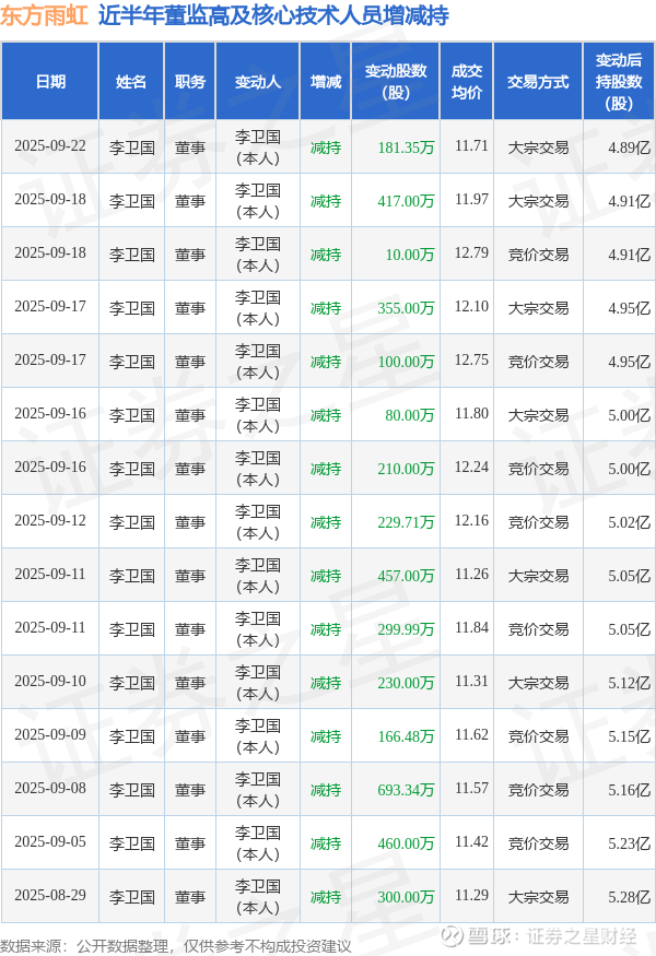 证券之星消息,根据9月23日市场公开信息、上市公司公告及交易所披露数据整理,东方雨虹(002271)最新董监高及相关人员股份变动情况:2025年9月22日公司董事李卫国共减持公司股份181.35万股,占公司总股本为0.0759%。变动期间公司股价下跌2.61%,9月22日当日收盘报12.33元。