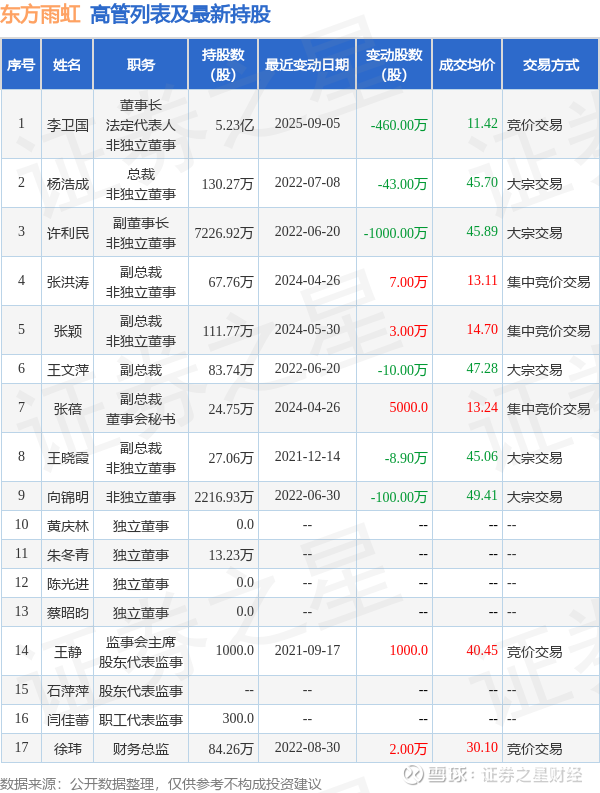 东方雨虹近半年内的董监高及核心技术人员增减持详情如下: