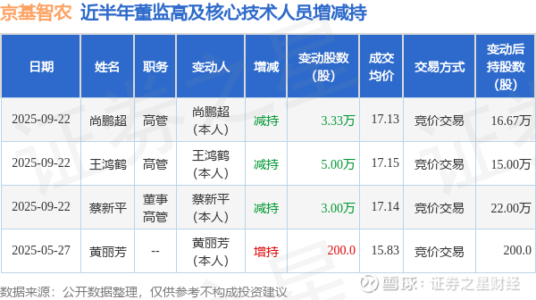 京基智农近半年内的董监高及核心技术人员增减持详情如下: