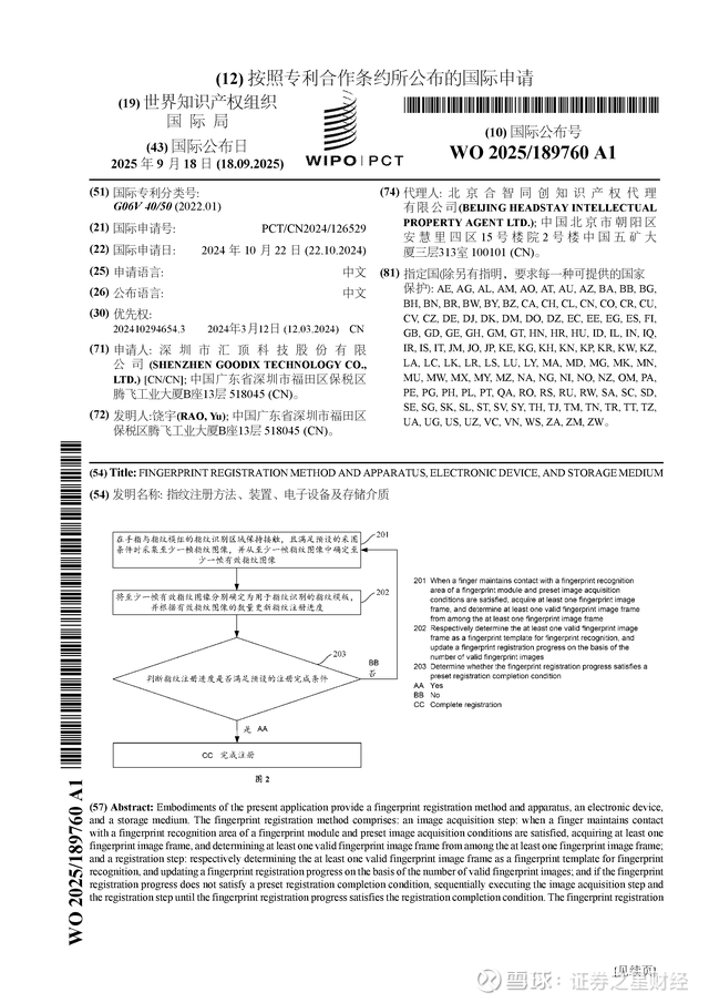 证券之星消息,根据企查查数据显示汇顶科技(603160)公布了一项国际专利申请,专利名为“指纹注册方法、装置、电子设备及存储介质”,专利申请号为PCT/CN2024/126529,国际公布日为2025年9月18日。