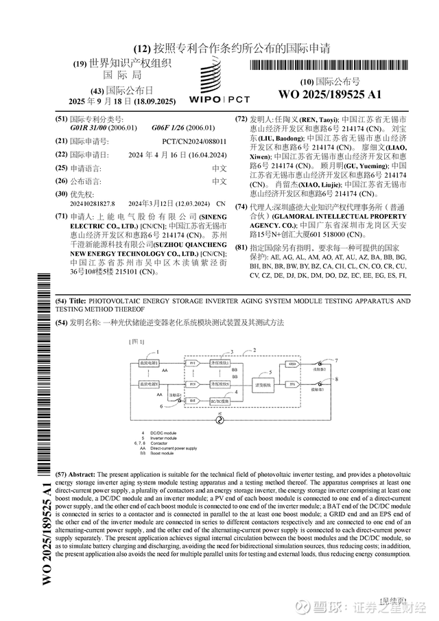 证券之星消息,根据企查查数据显示上能电气(300827)公布了一项国际专利申请,专利名为“一种光伏储能逆变器老化系统模块测试装置及其测试方法”,专利申请号为PCT/CN2024/088011,国际公布日为2025年9月18日。