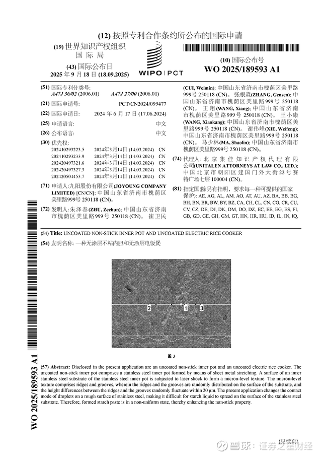 证券之星消息,根据企查查数据显示九阳股份(002242)公布了一项国际专利申请,专利名为“一种无涂层不粘内胆和无涂层电饭煲”,专利申请号为PCT/CN2024/099477,国际公布日为2025年9月18日。