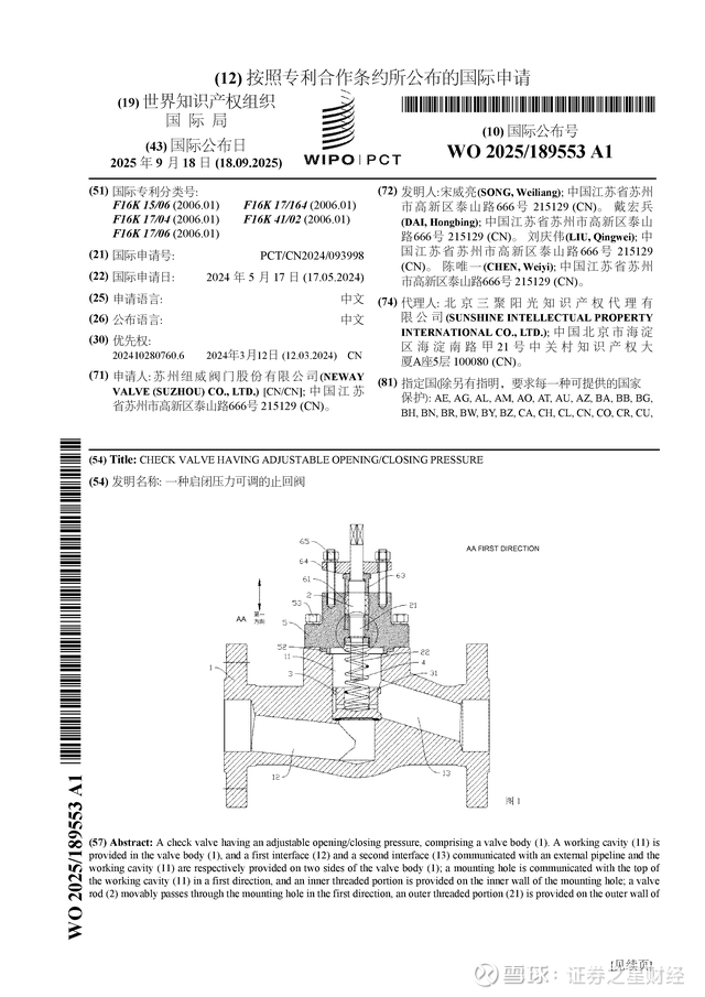 证券之星消息,根据企查查数据显示纽威股份(603699)公布了一项国际专利申请,专利名为“一种启闭压力可调的止回阀”,专利申请号为PCT/CN2024/093998,国际公布日为2025年9月18日。