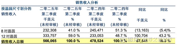 按晶圆尺寸划分,华虹公司主要提供8英寸和12英寸晶圆两大产品。2025年以来,公司传统的8英寸业务收入表现疲软,第一季度与第二季度收入分别为2.311亿美元和2.323亿美元,同比分别下滑3.7%与5.4%。
