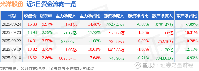 证券之星消息,光洋股份9月24日涨停收盘,收盘价15.33元。该股于13点12分涨停,3次打开涨停,截止收盘封单资金为5606.44万元,占其流通市值0.71%。