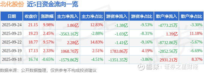 证券之星消息,北化股份9月24日涨停收盘,收盘价21.15元。该股于14点18分涨停,7次打开涨停,截止收盘封单资金为655.86万元,占其流通市值0.06%。