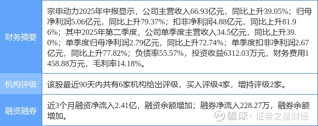 2025年8月27日,西南证券研究员邰桂龙发布了对宗申动力的研报《2025年半年报点评:聚焦主业布局新兴领域,上半年业绩实现高速增长》,该研报对宗申动力给出“买入”评级。研报中预计公司2025-2027年归母净利润分别为8.9、10.9、12.9亿元,对应当前股价PE分别为34、27、23倍,未来三年归母净利润复合增速为41%。公司聚焦核心主业,同时积极布局新兴领域,产业转型升级稳步推进,维持“买入”评级。证券之星数据中心根据近三年发布的研报数据计算,该研报作者对此股的盈利预测准确度为50.26%。
