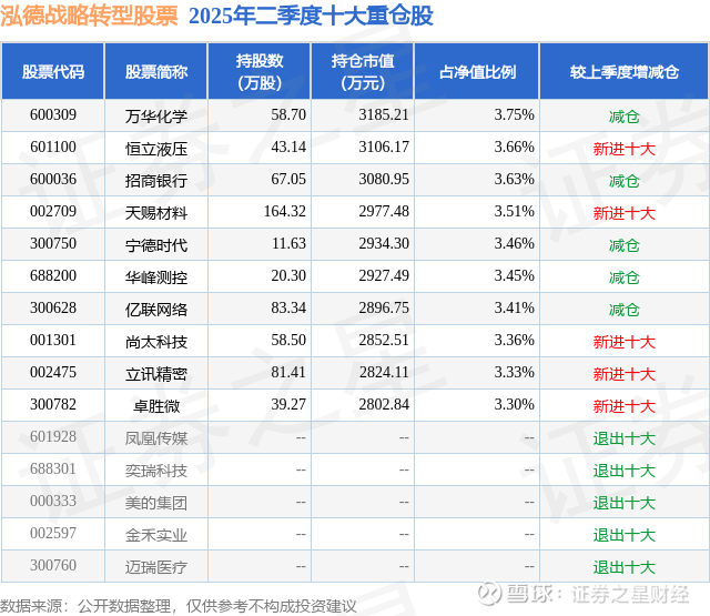 根据2025基金半年报公募基金重仓股数据,重仓该股的公募基金共7家,其中持有数量最多的公募基金为泓德基金的泓德战略转型股票。泓德战略转型股票目前规模为8.49亿元,最新净值1.4954(9月23日),较上一交易日上涨1.07%,近一年上涨47.07%。该公募基金现任基金经理为秦毅。秦毅在任的基金产品包括:泓德泓华混合,管理时间为2018年12月27日至今,期间收益率为221.8%;泓德睿泽混合,管理时间为2020年3月4日至今,期间收益率为28.37%;泓德睿源三年持有期混合,管理时间为2021年4月21日至今,期间收益率为-24.96%。