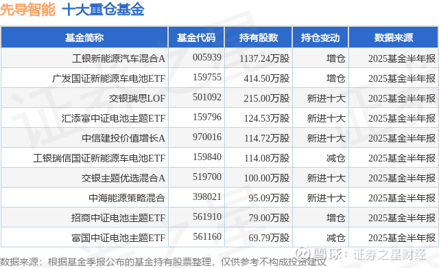 根据2025基金半年报公募基金重仓股数据,重仓该股的公募基金共51家,其中持有数量最多的公募基金为工银瑞信基金的工银新能源汽车混合A。工银新能源汽车混合A目前规模为16.29亿元,最新净值3.7051(9月23日),较上一交易日上涨0.73%,近一年上涨88.53%。该公募基金现任基金经理为张姝丽 邢梦醒 张剑峰。张剑峰在任的基金产品包括:工银新材料新能源股票,管理时间为2016年9月19日至今,期间收益率为115.45%;工银专精特新混合A,管理时间为2022年8月1日至今,期间收益率为2.38%;工银优质成长混合A,管理时间为2022年8月22日至今,期间收益率为-1.73%;张姝丽在任的基金产品包括:工银物流产业股票A,管理时间为2025年9月16日至今,期间收益率为1.07%。