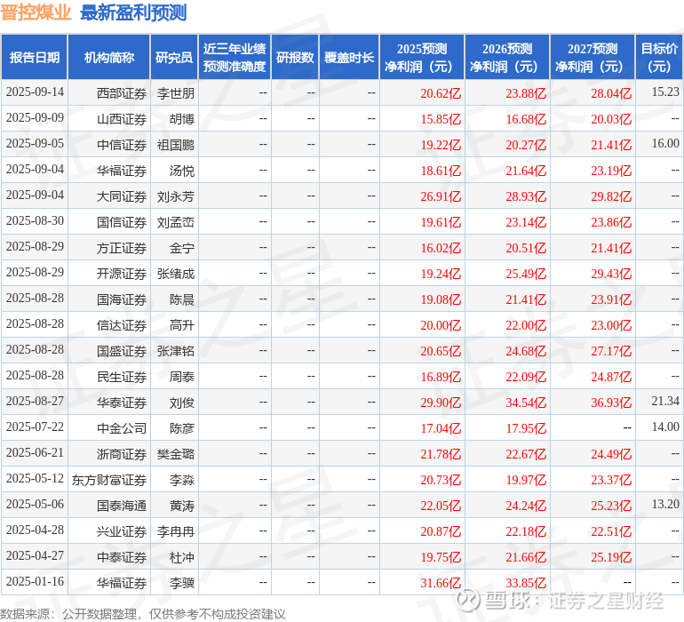 晋控煤业(601001) 存量利润丰厚,增量利润可期 公司目前主要的资产是塔山煤矿、色连煤矿和同忻煤矿,三个煤矿产能分别为2660万吨/年、800万吨/年、1600万吨/年。其中合并报表范围内的核定产能3460万吨,合并报表范围内的权益产能2323万吨。此外,公司参股的同忻煤矿的收益归于投资收益,同样贡献于公司利润。根据公司2025年1月16日公告,公司将收购控股股东晋能控股集团旗下的潘家窑矿探矿权及相关资产,设计生产能力为1000万吨/年。若收购后建成,公司总产能将增长19.8%,权益产能将增长35.3%,建成后有望贡献利润增量。 其中,塔山煤矿是最重要的资产,不仅在产销量占比是最高的,而且我们推测可能是其中煤质最好的煤矿,因为其吨煤售价、吨煤毛利、吨煤净利润都属于较高水平。 资产负债率较低,存在超额分红空间 公司的亮点在于比较健康的负债率,2018-2024年期间,公司的资产负债率从61%降至28.9%,降幅约为32.1pct,远高于行业平均,且截止2024年末,公司的短期借款为0亿元、长期借款为3亿元,偿债压力较低。公司分红比例从2021年的14.37%提升至2024年的45%,2024年每股分红约为0.76元,对应2025年9月12日的股价13.16元,静态股息率约为5.8%。2024年公司每股股东自由现金流1.19元,假设全部作为分红发放给股东,静态股息率可达到9%。 公司吨煤售价稳定,呈现低波动率 从2022年来看,公司吨煤售价略微下行、其他公司吨煤售价上行,而2024年大部分公司售价下行、但公司吨煤售价基本持平,公司2016-2024年的吨煤售价方差在可比公司中亦偏低。 盈利预测与估值 我们预测2025-2027年归母净利润分别为21.1/23/24.7亿元,EPS分别为1.26/1.37/1.48元。我们选取中国神华、陕西煤业、山煤国际作为估值可比公司,公司目前的估值低于行业平均,考虑到未来公司煤炭业务仍具有成长性,我们给予公司2025年利润14倍PE,对应目标价为17.64元,首次覆盖,给予“买入”评级。 风险提示:煤炭供给超预期增长;煤炭进口量超预期增长;经济增长不及预期;水电发力超预期;存在交易异动风险