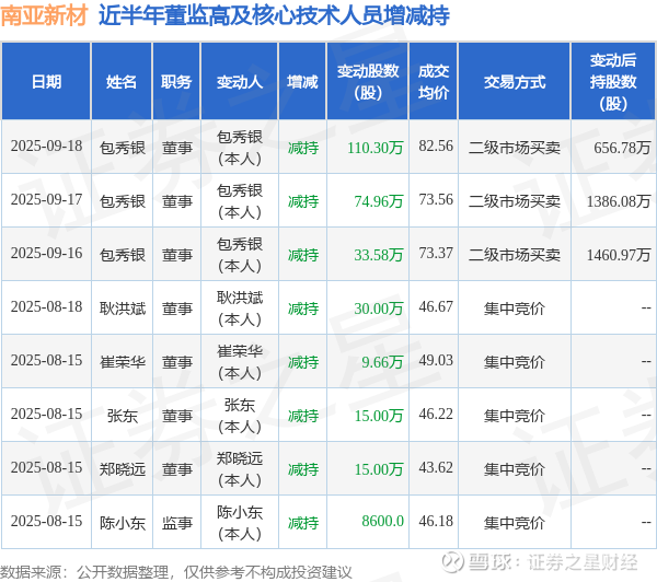 南亚新材近半年内的董监高及核心技术人员增减持详情如下:
