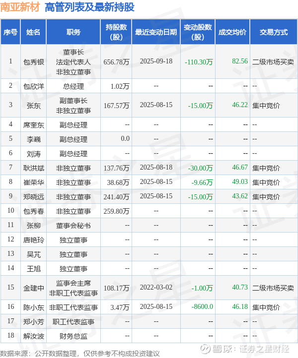 南亚新材的高管列表及最新持股情况如下: