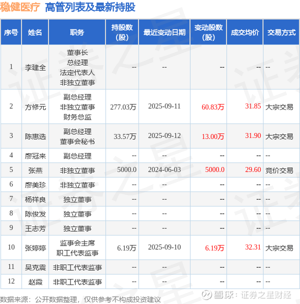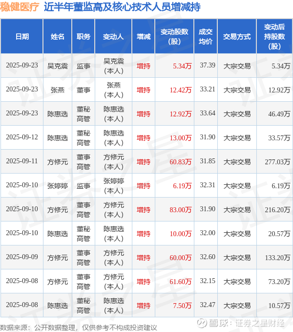 证券之星消息,根据9月24日市场公开信息、上市公司公告及交易所披露数据整理,稳健医疗(300888)最新董监高及相关人员股份变动情况:2025年9月23日公司董秘,高管陈惠选、董事张燕、监事吴克震共增持公司股份30.68万股,占公司总股本为0.0527%。变动期间公司股价下跌2.31%,9月23日当日收盘报37.62元。
