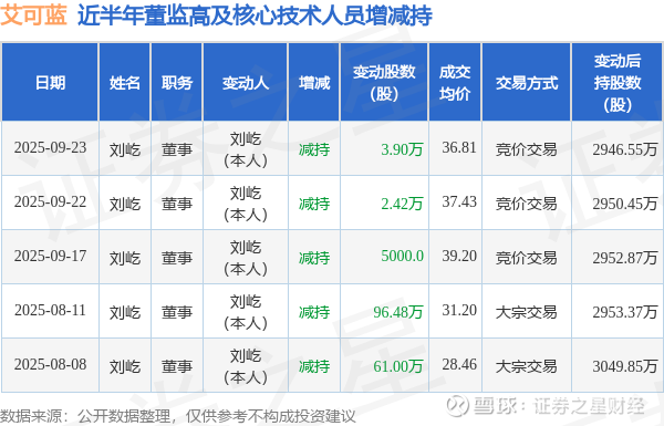 证券之星消息,根据9月24日市场公开信息、上市公司公告及交易所披露数据整理,艾可蓝(300816)最新董监高及相关人员股份变动情况:2025年9月23日公司董事刘屹共减持公司股份3.9万股,占公司总股本为0.0488%。变动期间公司股价下跌1.3%,9月23日当日收盘报37.07元。